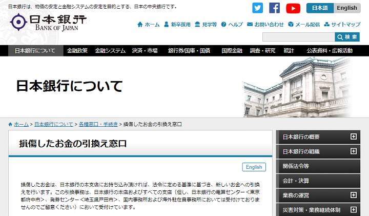 損傷したお金の引換え窓口→ 日本銀行 Bank of Japan