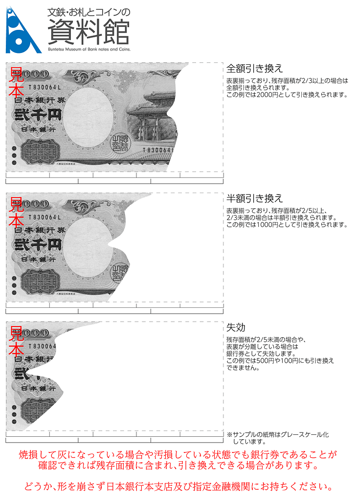 基本的には、お札の3分の2以上が残っていれば、額面通りの金額で新しいお札と交換することができます。
