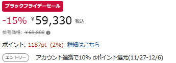 現在、Amazonでは15%割引中!通常価格69,800円が、59,330円(税込)で購入可能です。