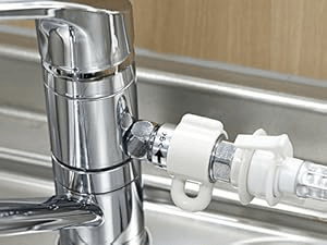 自動給水式で付属のバケツに水を入れて給水するだけ。分岐水栓にも対応しているので、キッチンに応じて選べます。