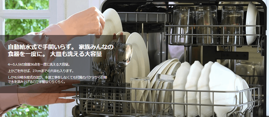 - 4~5人分の大容量! 36点の食器が一度に洗えるので、忙しい夕食後もラクラク。