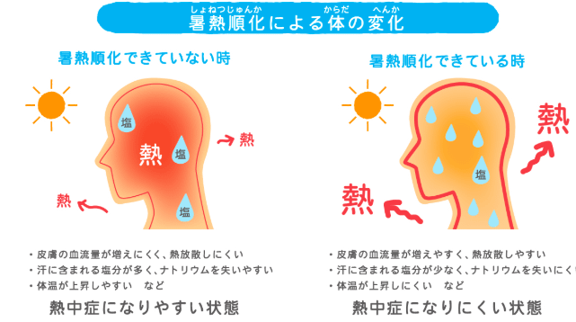 これは運動や入浴時に意識的に汗をかくことで、体が暑さに順応し、効率的に体温調節ができるようになる仕組みです。