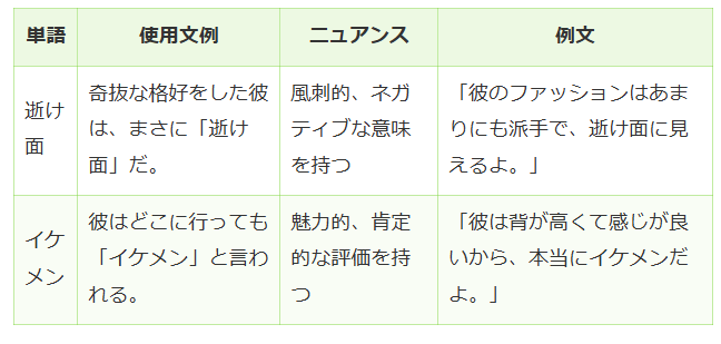 つまり、「イケメン」は主に外見の良さを指し、一目でその意味が伝わる一方で、「逝け面」はその言葉遊びから来るユーモアによって使われることが多いです。