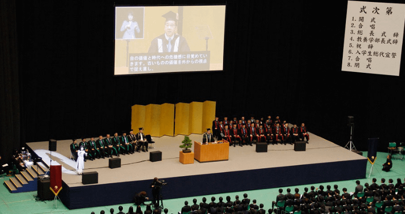 学長や在学生からの温かい歓迎の言葉があり、新入生もすぐに大学生活に馴染めるような雰囲気があります。