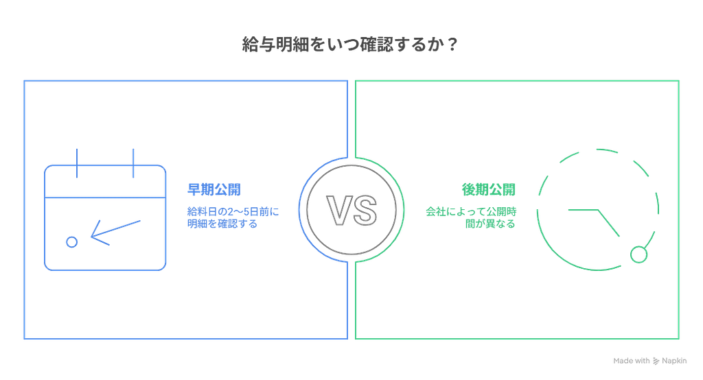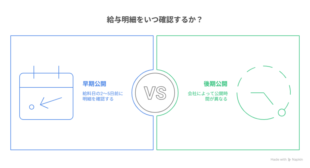 たとえば、毎月の給料日が25日なら、20日〜23日あたりには明細が確認できる可能性が高いです。ただし、会社ごとに明細の公開される時間帯が違うこともあります。朝に見られる会社もあれば、夕方に公開するところもあるので、職場からの連絡やお知らせに注意しておきましょう。