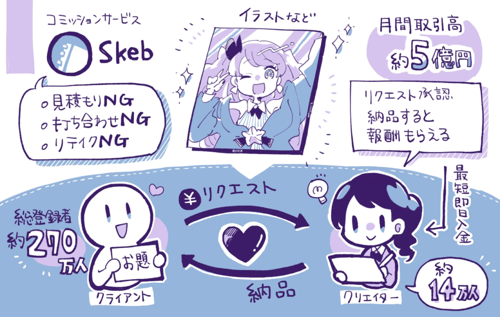 Skebは2017年に設立された株式会社スケブが運営し、現在は実業之日本社の子会社として運営されています。世界中のファンが日本のクリエイターに対してイラスト、音声データ、動画作品などを有償でリクエストできるシステムを提供しています。