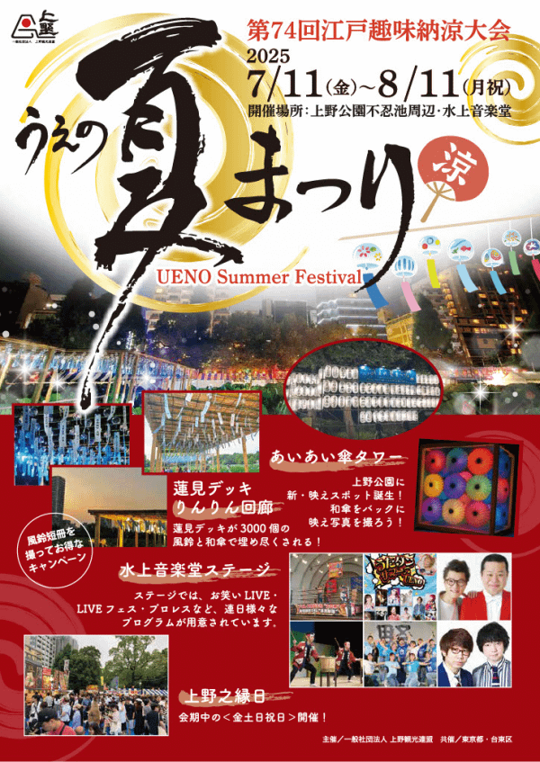 上野公園で開催される「うえの夏まつり」は、本当に家族みんなで楽しめるイベントなんですよ。金土日祝日には縁日が出て、屋台グルメも味わえるし、不忍池の水上音楽堂では音楽ライブや演劇が日替わりで行われてるんです。