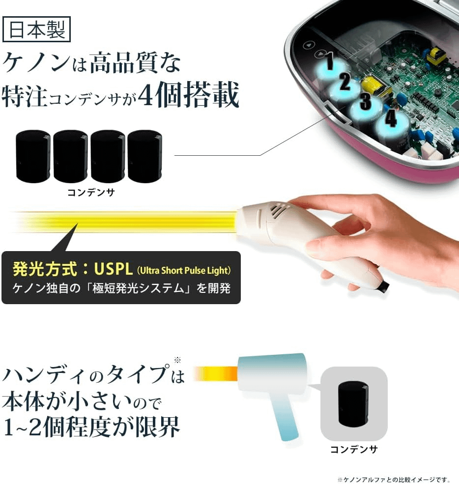 ケノンは特注コンデンサ(心臓部品)4機搭載!ヒゲ・アンダーほぼ全身に。ケノンは照射間隔が最短0.4秒(Lv.1 連発モード)&発光面積が広い!だから超スピード。付属のスーパープレミアムカートリッジはLv.1で最大300万発もの照射が可能。