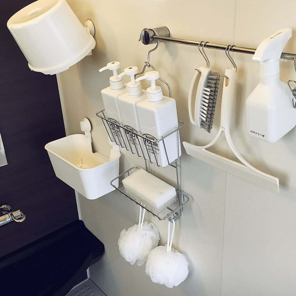 シャンプーボトルだけでなく、石鹸や洗顔料、掃除用具などもまとめて収納したい!という方には、複数のボトルを置けるラックや、小さな棚が付いているタイプが便利です。吸盤やマグネットで壁に取り付けるものが主流です。