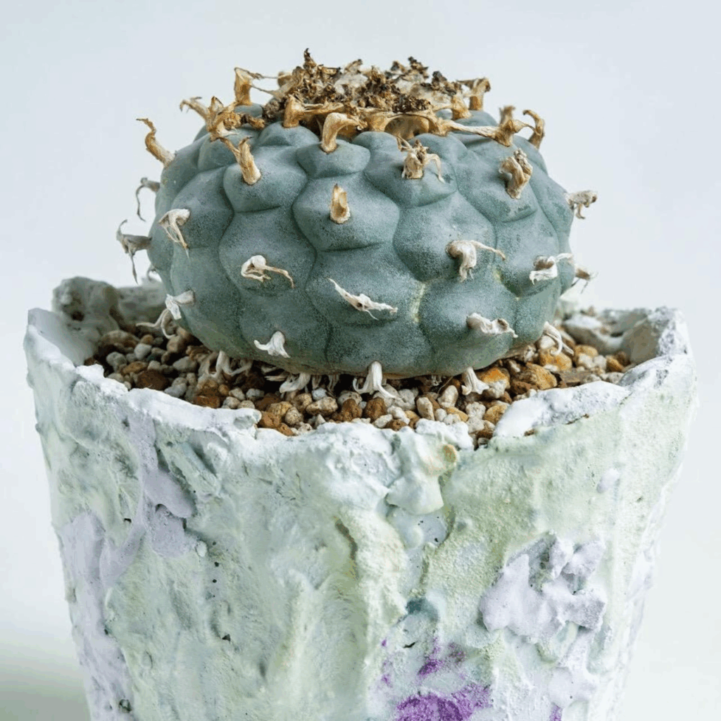 針を持たず、柔らかな毛に覆われた丸みを帯びた姿が愛らしい品種です。触感も柔軟で、親しみやすい外観をしています。頑健で長期間の栽培が可能です。ロフォフォラ属(学名:Lophophora)は、サボテン科ウバタマサボテン属の植物群です。 主にメキシコ中西部やアメリカ南西部の高原地帯に自生しており、地下に一時芋状の塊状の茎を持ち、地上部は扁平で柔らかい肉質で綿毛が密生し、トゲはありません。