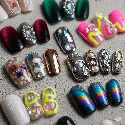 | 未来の質感・異素材感 | メタリック、ラメ、パール、オーロラパウダー、クリア系 | ベージュ+メタルラメ/クリアベース+偏光ホログラム |